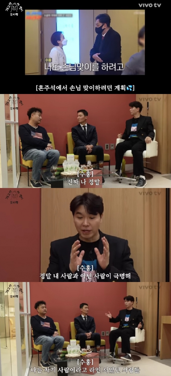 박수홍은 결혼식 때 혼주석에서 손님맞이를 했던 김수용을 떠올리며 "그 장면만 떠올리면 눈물이 난다"면서 "(박) 경림이, (김) 국진이 형, (이) 수영이, (유) 재석이나 (지) 석진이 형 다 고맙다. 근데 수용이 형이 누구보다 먼저 와서 나를 지켜주는 데 덩치도 좋으니까 내 뒤에 큰 산 하나가 있는 것 같더라. 내가 이 어려움 지나면 '수용이 형한테 잘해야지'라고 결심해서 지금 잘하고 있다"고 했다.
