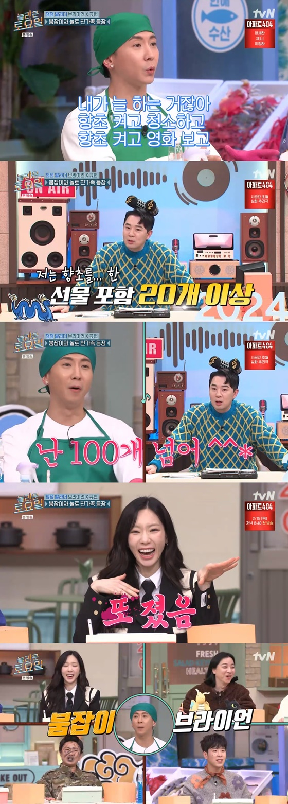 지기 싫었던 붐은 "난 집에 향초가 20개있다"고 반격했고, 브라이언은 "놀고 있다. 나는 100개 넘는다. 20개 같은 소리 하지 마라. MC 좀 바꿔달라. 그래야 이 프로그램이 발전할 것 같다. 나랑 배틀 붙으려고 하지 마라"고 일갈해 웃음을 안겼다.