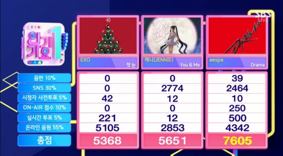 1위 후보로는 엑소 '첫눈', 제니 '유앤미'(You & me), 에스파 '드라마'(Drama)가 이름을 올렸다. 특히 엑소의 '첫눈'은 2013년 12월에 발매된 곡으로, 지난해 말부터 SNS 챌린지와 함께 음원 차트에서 역주행하고 있는 상황. 이에 음악 방송 1위 후보로도 올라 이목을 끌었다.