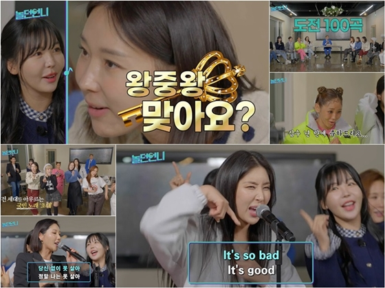 이날 '놀던언니 팀'과 '짝꿍 팀'으로 나뉜 출연진은 '절친 모드'를 해제하고 '도전 100곡' 미션으로 '승부 모드'에 돌입한다. 대결에 앞서 레이나는 "'도전 1000곡'에서 우승한 적 있다"며 자신감을 드러내고, 이에 이지혜는 "난 '왕중왕전'에서 우승한 적이 있다. 집에 금 열쇠도 있다"고 받아친다. 레이나가 "나도 금 열쇠가 있다"고 다시 응수하자, 이지혜는 "큰 거! 한 돈짜리 말고 한 냥짜리 맞아요?"라며 기싸움을 폭발시킨다. 레이나는 결국 "언니 무서워요"라며 한발 물러서고, 기세에 눌린 트루디는 "진심으로 축하드립니다"라며 십수 년 만에 축하 인사를 건네 모두를 배꼽 잡게 만든다.