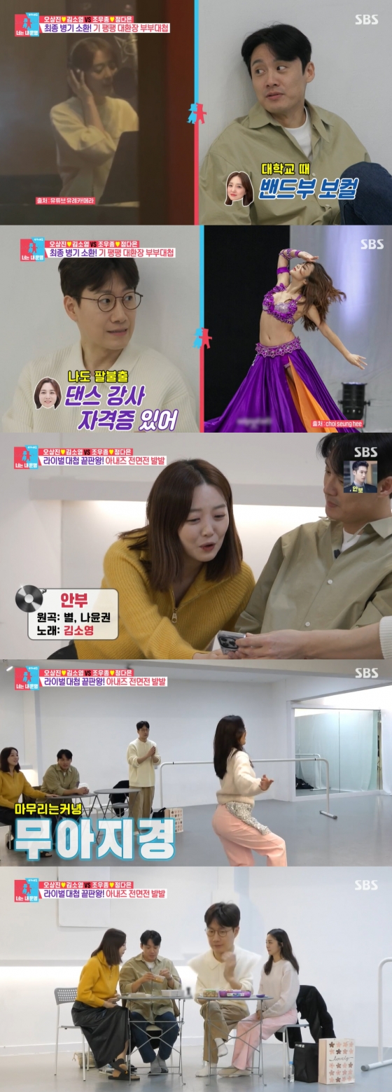 오상진은 "소영이가 대학교 때 밴드부 보컬이었다"라며 "노래 진짜 잘한다. 가수처럼 잘한다. 형이 들어보면 놀랄 것"라고 도발했다. 이에 조우종은 "우리 아내는 댄스 강사 자격증이 있다. 국제 대회에서 우승했다"라며 지지 않고 맞받아쳤다.