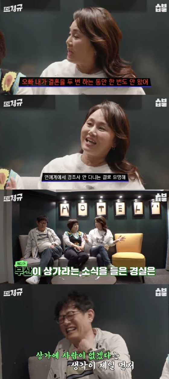 이날 이경실은 이경규에게 서운한 점에 대해 "평소 경조사에 잘 안 다닌 걸로 유명하다"며 "나 경사 있을 때 한 번도 온 적 없다. 내가 결혼을 두 번 하는 동안 한 번도 안 왔다"고 밝혔다.