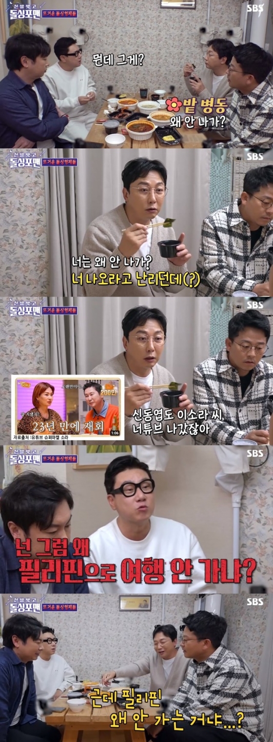 옆에 있던 김준호가 "한 번 나가요. 도와줘야지"라고 너스레를 떨자, 이상민은 "그러면 김준호 너는 왜 필리핀으로 여행 안 가냐. '독박투어'"라며 김준호의 전처를 간접적으로 언급했다. 이에 탁재훈은 "하지마. 맨날 이러다 큰 싸움 나고. 누가 먼저 시작했어?"라고 따졌다. 그러자 이상민은 "형이 먼저 시작했잖아"라고 받아쳤다.