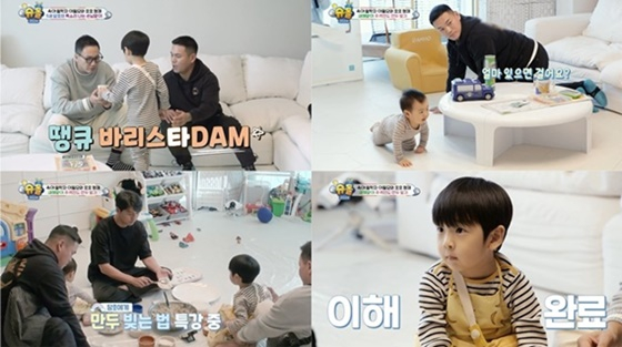 그런가 하면 지난달 아데노이드 비대증 수술을 받았던 담호가 성공적인 수술과 함께 건강해진 모습으로 돌아왔다. 또한 16개월 도호는 옹알이 대화와 댄스 실력을 뽐냈다. 이어 아빠 이필모의 절친인 더원과 이정이 등장했다. 이정은 "짐이 다 아이들 거네요?"라며 신기해했고, 더원 또한 "모든 게 아이들 중심이구나"라며 미혼이었던 친구 이필모의 달라진 집 풍경에 놀라워했다. 이 가운데 담호는 삼촌들을 위해 직접 커피를 준비하기도 했다. 꼬마 바리스타로 변신한 담호는 스스로 커피 머신의 버튼을 누르는 야무진 매력을 뽐냈고, 이에 이정은 "어쩜 이렇게 예뻐요. 형이 보면 얼마나 더 예쁠까?"라고 말했다.
