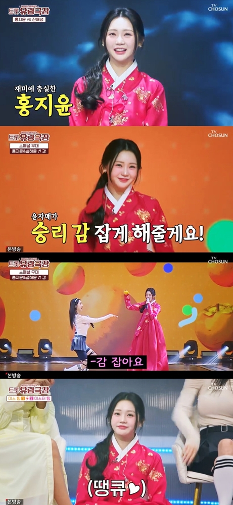 이후 홍지윤은 진해성의 대결 상대로 지목돼 '이 오빠 뭐야' 무대를 선보이며 시선을 모았다. 홍지윤은 연기력을 발휘한 '이 오빠 뭐야' 무대로 새침한 매력을 뽐내는가 하면, 고운 한복과 어울리는 아름다운 자태로 보는 이들을 매료시켰다.