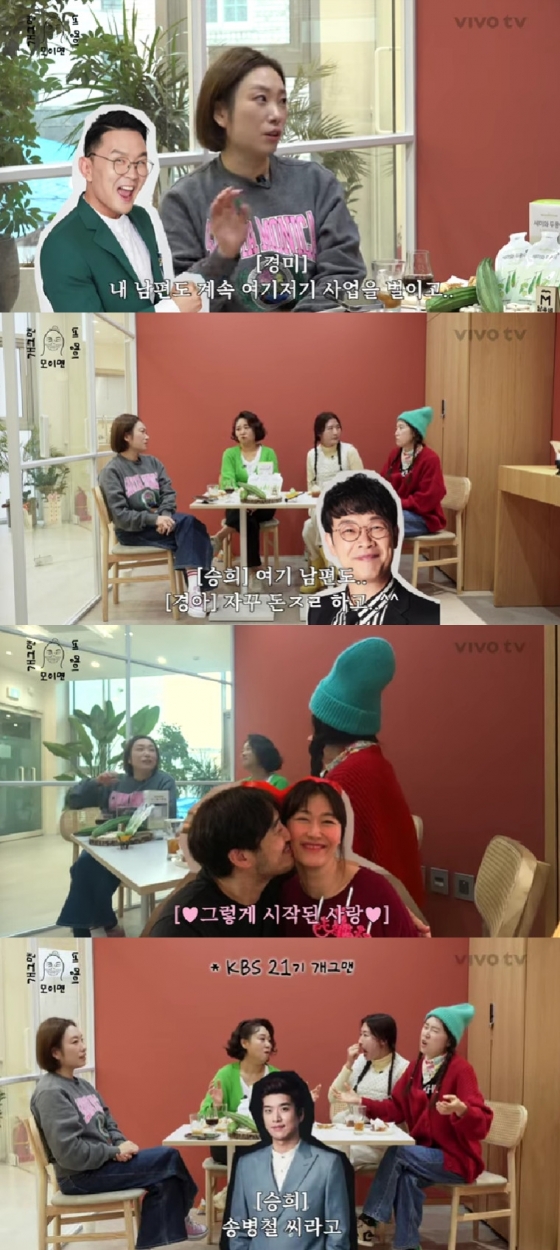 이날 조승희는 "제가 가까이서 오랫동안 봤는데 꾸준히 하는 이야기가 있다. 연예인끼리 결혼하는 거 되게 좋은 것 같다"고 말했다. 김미려는 배우 정성윤과 결혼했고, 정경미, 김경아는 각각 윤형빈, 권재관과 결혼한 '코미디언 부부'다.