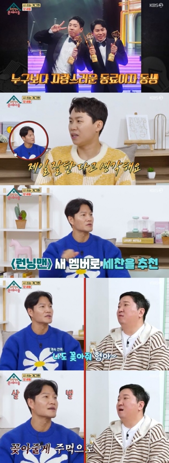 이어 그는 '형으로서 동생 양세찬을 보면 어떠냐'는 질문에 "가족이라서 하는 말이 아니라 선배님들 제외하고 저희 코미디언 기수 중엔 제일 잘한다고 생각한다"고 의견을 전했다.