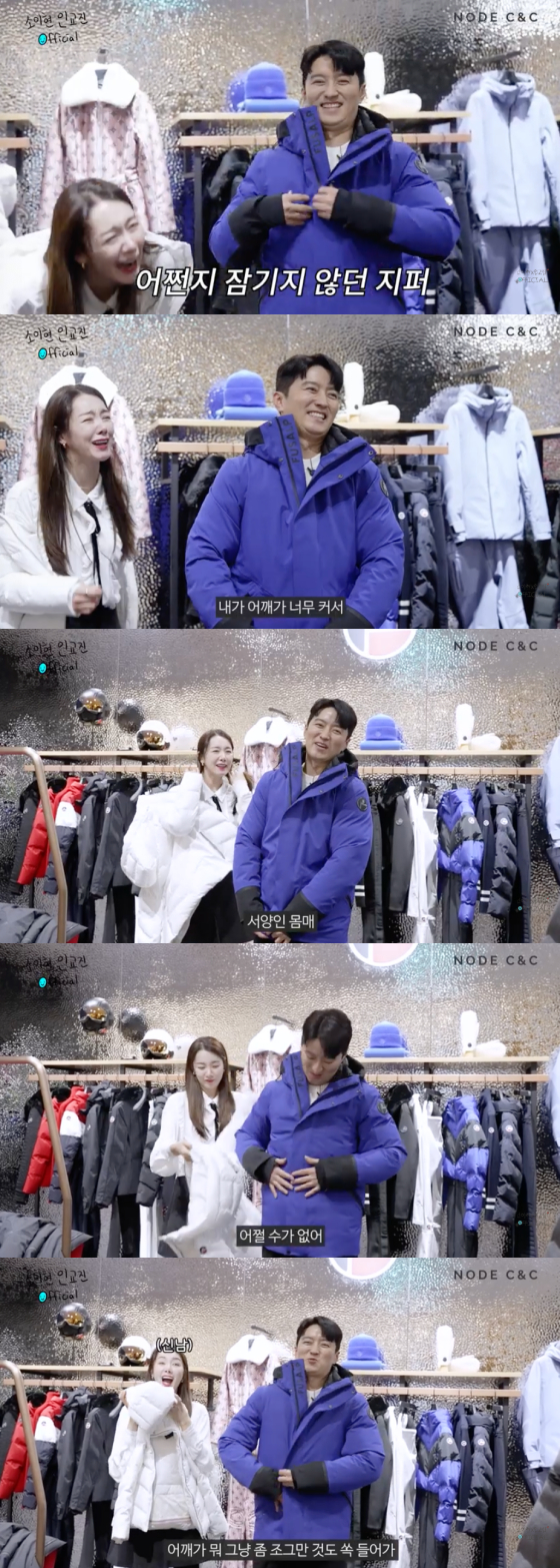 인교진은 그러면서 "근데 나는 착착 맞는다. 동양인 (몸매). 어깨가 뭐, 그냥 좀 조그만 것도 쏙 들어간다"며 웃었다. 그 사이 패딩을 벗고 손에 든 소이현은 인교진 옆에서 "이렇게 입으면 예쁘겠다"며 미소지었다.