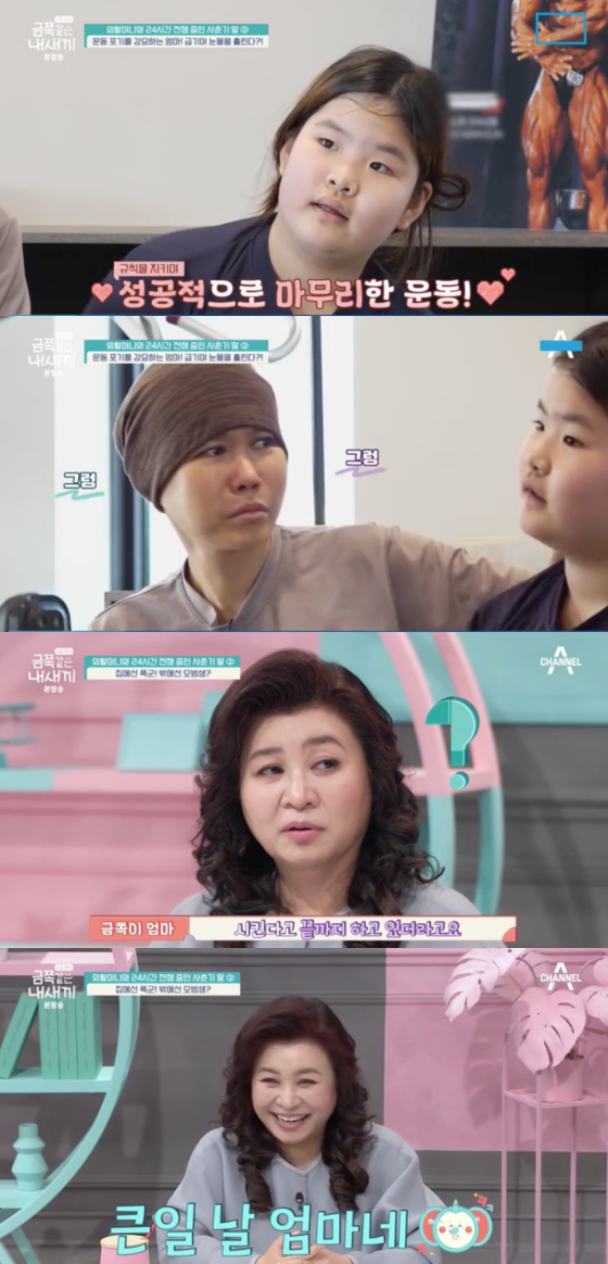 그러나 옆에서 이를 지켜보던 금쪽이 엄마는 "못하겠으면 못하겠다고 얘기해도 된다"고 포기를 권하더니 급기야 눈물까지 흘려 충격을 안겼다. 금쪽이 엄마는 "날씬한 사람도 힘들지 않냐. 근데 1시간 넘게 운동하니 걱정됐다. 포기해도 되는데"라 고백했다.