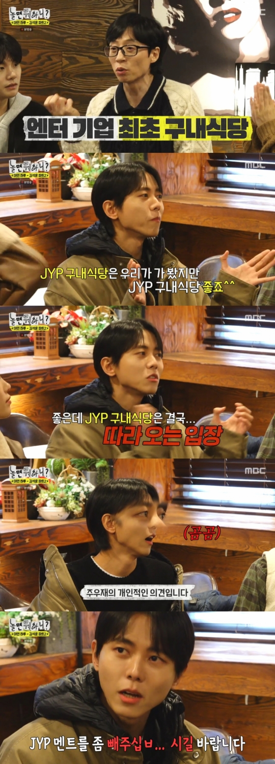 특히 주우재는 "사옥을 옮기면서 지금 식당이 더 쾌적해졌다. JYP 구내식당은 우리가 가봤지만, 좋은데 결국에는 따라 오는 입장 밖에 안 된다"라며 JYP 구내 식당을 견제하는 듯한 소신 발언을 해 출연진들을 당황케 만들었다. 실제로 유재석, 박진주 등은 "괜찮냐. 확실하냐"라며 주우재를 걱정했다.