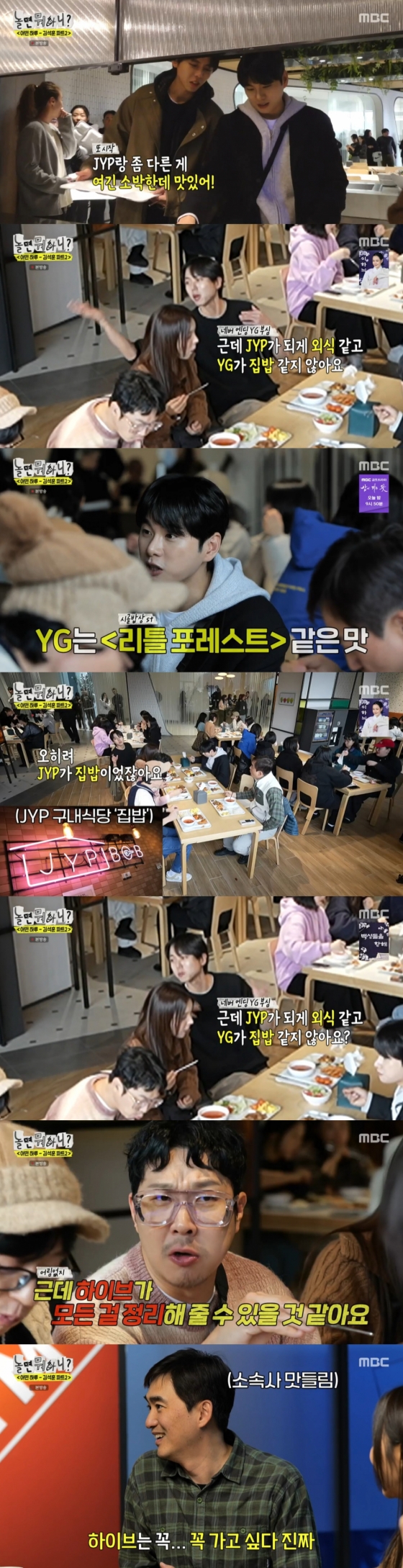 YG 구내식당에서 식사를 끝낸 주우재는 "(구내식당 중) 1등이 YG인가?"라는 김석훈의 말에 "JYP를 갔을 때 솔직히 비교를 할 수 없을 정도로 너무 맛있었기 때문에 뭐가 더 낫다 이런 게 없는 것 같다"라고 털어놨다.