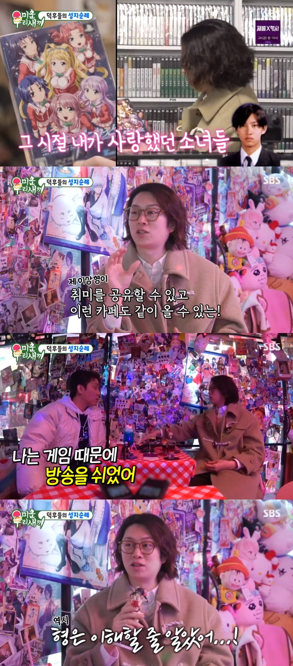 또한 김희철은 이상형에 대해 "취미를 공유할 수 있고, 애니메이션 카페도 같이 올 수 있는 사람"이라며 "게임이나 만화 보다가 여자친구랑 다툰 적 있냐. 나는 게임을 하다가 여자친구랑 헤어졌다"고 했고, 은지원은 "이해한다. 나는 게임 때문에 방송을 3년 쉬었다. 다른 사람들은 그걸 이해 못하는데 그 게임이 40명이 같이 하는 건데 스케줄이 있으면 그 모임에 못 간다. 나 하나 때문에 40명 약속이 취소되는 거다. 그래서 방송을 쉬었다. 후회는 안 하는데 또 하라고 하면 못 한다"고 밝혔다.