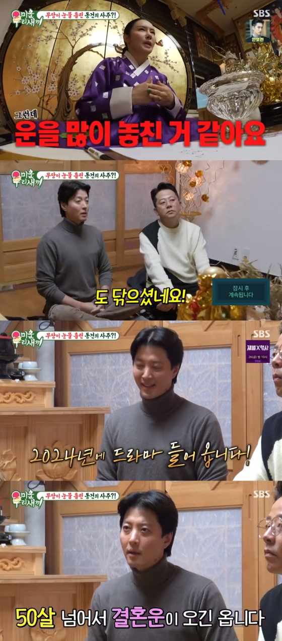 그러면서 "지금 결혼 생각 없고, 여자 보기를 돌같이 하고 있다. 50살 넘어서 결혼 운이 오긴 온다. 사업하는 여자분을 만나야 한다. 연예인은 안 된다. 연예인을 만나면 네 번 다섯 번 이혼한다"고 강조했다. 이동건은 "우연히 관상 선생님을 뵌 적이 있는데 아들이 보인다고 하시더라"라고 했고, 무속인은 "있다. 늦둥이가 보인다. 귀한 아들이 있다"고 말했다.