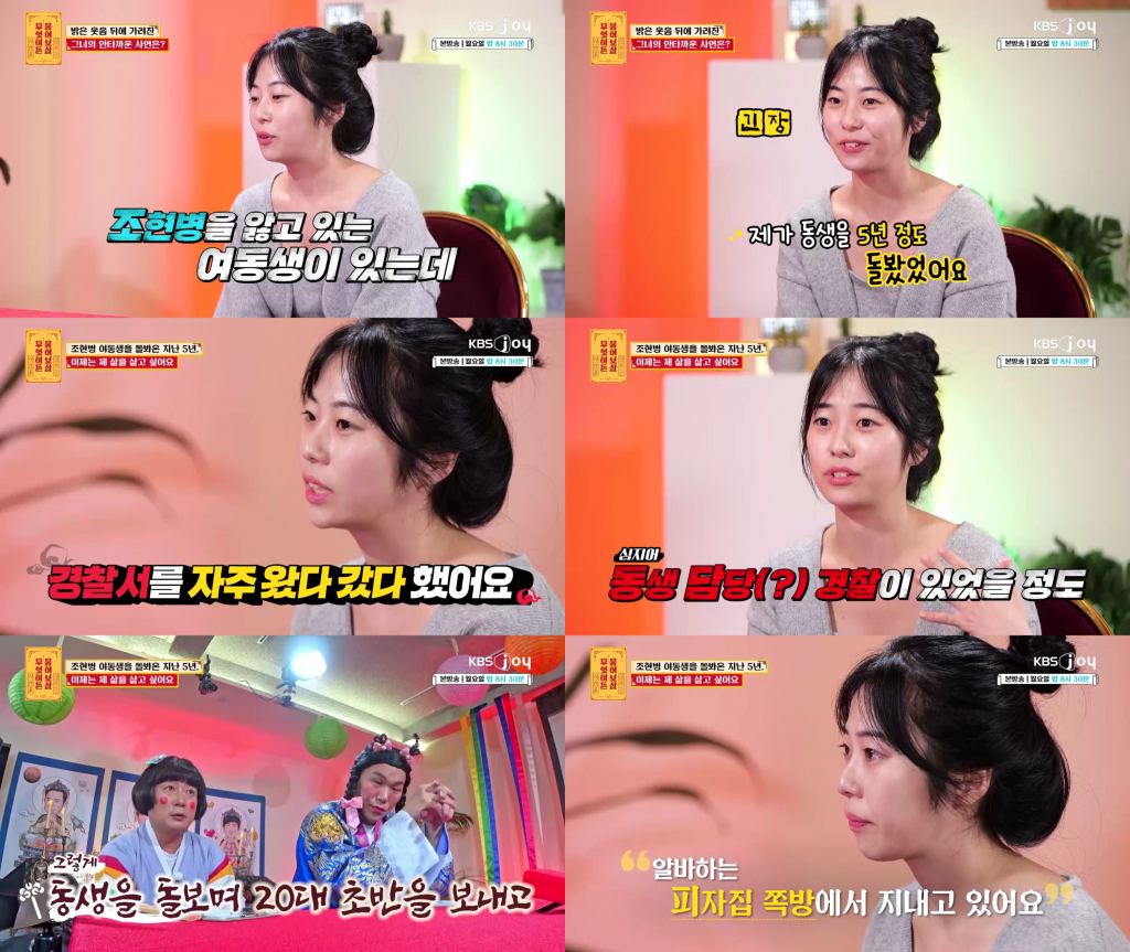 "가정이 안정적이고 편안하면 동생 걱정 없이 자기 자신만 신경 쓰면서 살 텐데"라며 이수근이 위로하자 눈물을 터뜨린 사연자는 "여동생은 지금은 아버지와 함께 살면서 정신과 센터에서 치료를 받고 있고 저는 서울에서 알바하고 있는 피자집 쪽방에서 지내고 있다"라고 현재 상황을 털어놨다.