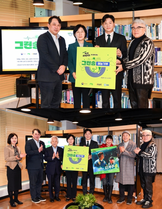 이날 기부식에는 한화진 환경부장관, 최영인 스튜디오프리즘 대표, 전상진 이마트 지원본부장, 이경희 이마트 ESG담당 상무, 권병현 미래숲 대표, 작곡가 김형석, 배우 정상훈이 참석해 '그린송' 기부서를 전달했다.
