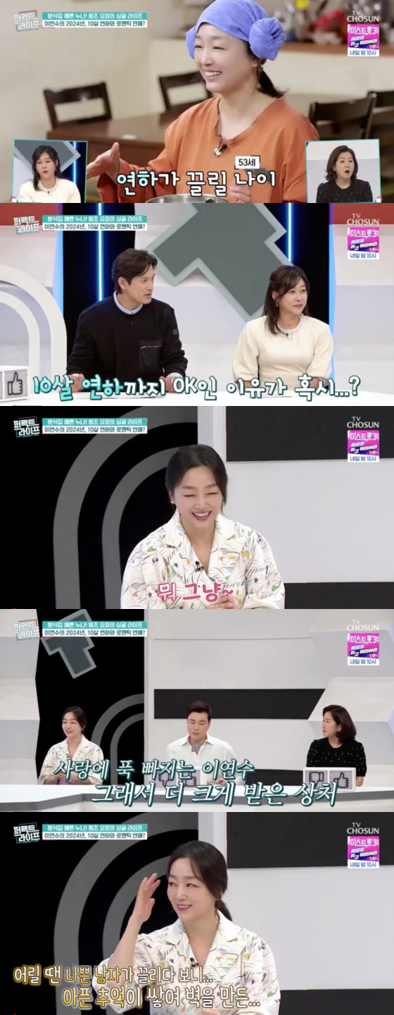 이성미는 "그럼 두 가지다. 처음 연애할 때 데여서 안 하는 경우와 너무 사랑한 사람을 못 잊어서 못하는 경우"라 말했고, 이연수는 "전자 쪽"이라며 "한번 사랑할 때 푹 빠지는 성격이라 어릴 때 제게 나쁘게 한 친구들에 대한 상처가 있다"고 전했다.