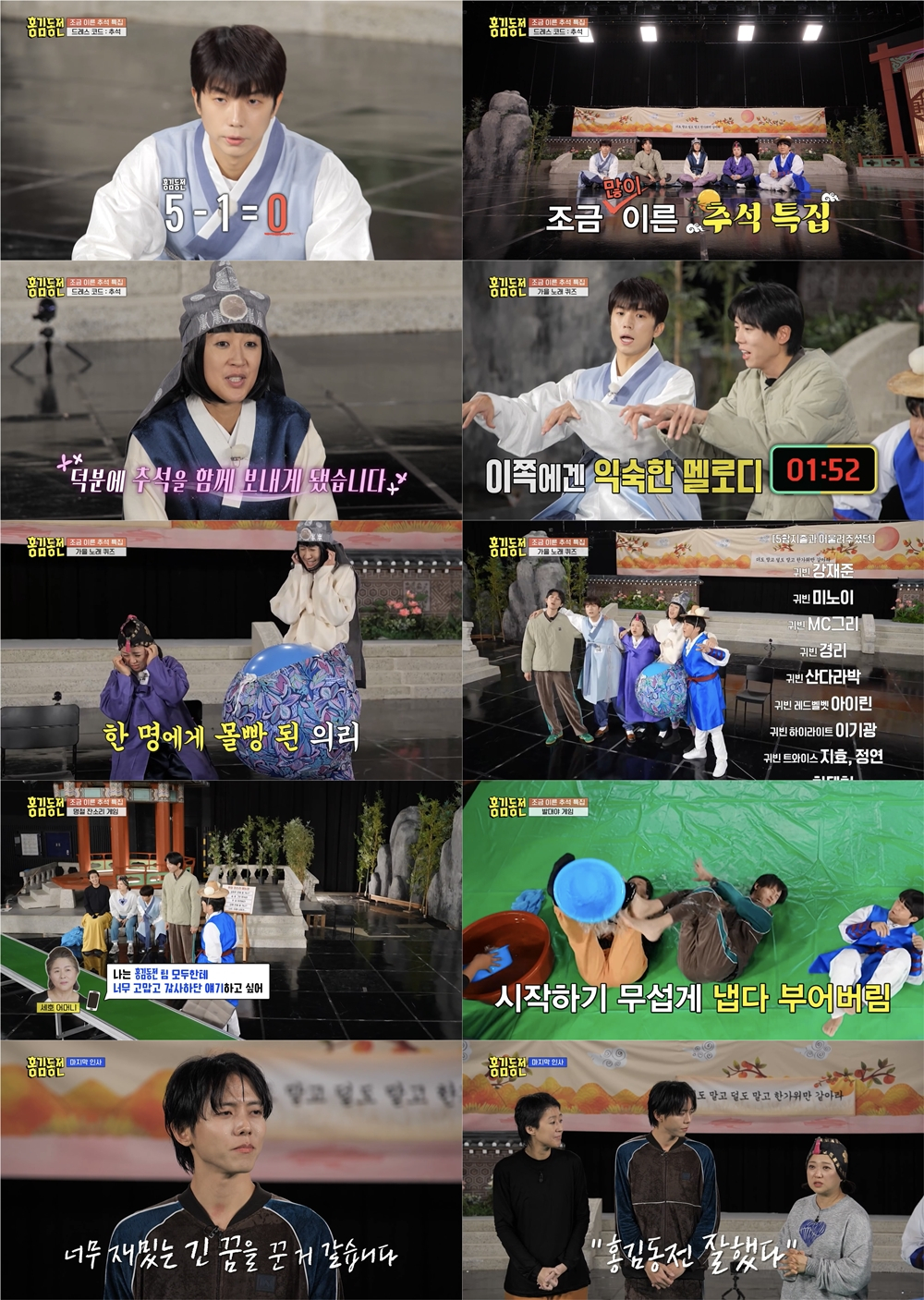 지난 18일 방송된 KBS 2TV 예능프로그램 '홍김동전'(연출 박인석) 마지막 회는 이른 한가위를 맞은 멤버들의 모습을 그린 '한가위 특집'이 방영됐다. 멤버들은 첫 번째 미션으로 완연한 가을을 맞아 '가을 노래 퀴즈' 와 함께 벌칙으로 풍선 바지가 등장했는데 또 다시 홍진경이 풍선 바지에 낙점되면서 벌칙마저 유종의 미를 거뒀다.
