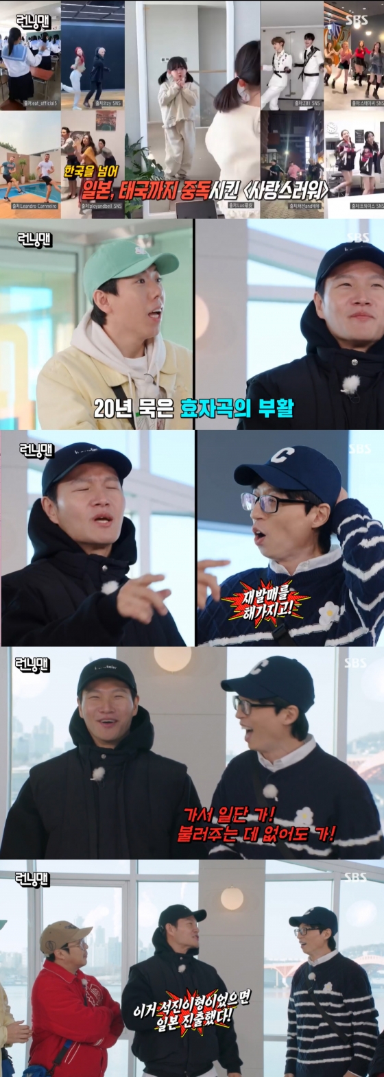 이를 들은 김종국은 "이거 석진이 형이었으면 일본 진출했을 것"이라며 활동 중단한 지석진을 언급하기도 했다. 오늘 처음 김종국 '사랑스러워'의 역주행 소식을 처음들은 송지효는 "나 젊은이라 따라 해야 한다"라며 들뜬 모습을 보였다.