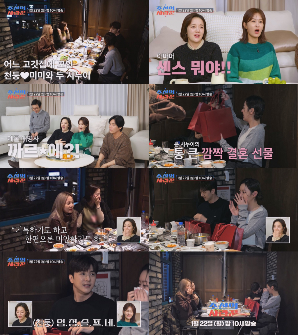 22일 방송되는 TV조선 예능 프로그램 '조선의 사랑꾼' 27회에서는 5월 결혼 예정인 '아이돌 예비부부' 천둥♥미미와 천둥의 큰누나 산다라박, 작은누나 박두라미가 함께 고깃집에서 식사하는 모습이 공개된다. 식사 중에 산다라박은 잠시 자리를 뜨는 척하며 고급스러운 쇼핑백을 들고 나타나 "내가...결혼 선물을 준비했는데..."라며 쑥스러워했다.