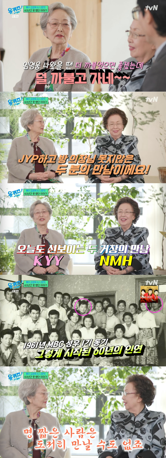 1961년 MBC 성우 1기 동기로 만난 김영옥과 나문희는 무려 60년이었다. 두 사람은 "명 짧은 사람은 도저히 만날 수도 없다"며 데뷔 초에는 "우리 둘이 다 해먹었다. 정말 MBC 기둥뿌리 하나는 우리가 더빙한 것"이라 너스레를 떨었다.