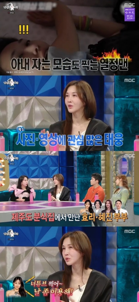 이날 방송에서 윤혜진은 유튜브를 가내 수공업으로 하고 있다고 밝혔다. 그는 "남편이 촬영해주고 기획도 없이 막 찍는다"며 "남편만 준비되면 카메라를 킨다. 내가 자는 모습도 찍는다. 사진과 영상에 엄태웅이 관심이 많다"고 설명했다.