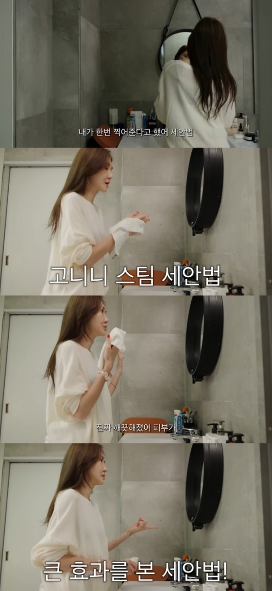 이어 "간단히 말해서 스팀 타올한다고 생각하면 돼. 우리가 보통 폼클렌징이나 계면활성제가 많이 포함되어 있는 거를 계속 밤낮으로 해주는 게 불필요하게 필요한 기름을 빼간대. 그래서 오히려 그런 계면활성제를 얼굴에 조금 피해주면서, 이걸로 한 지 꽤 됐는데 정말 피부가 맑아졌어"라고 설명했다.