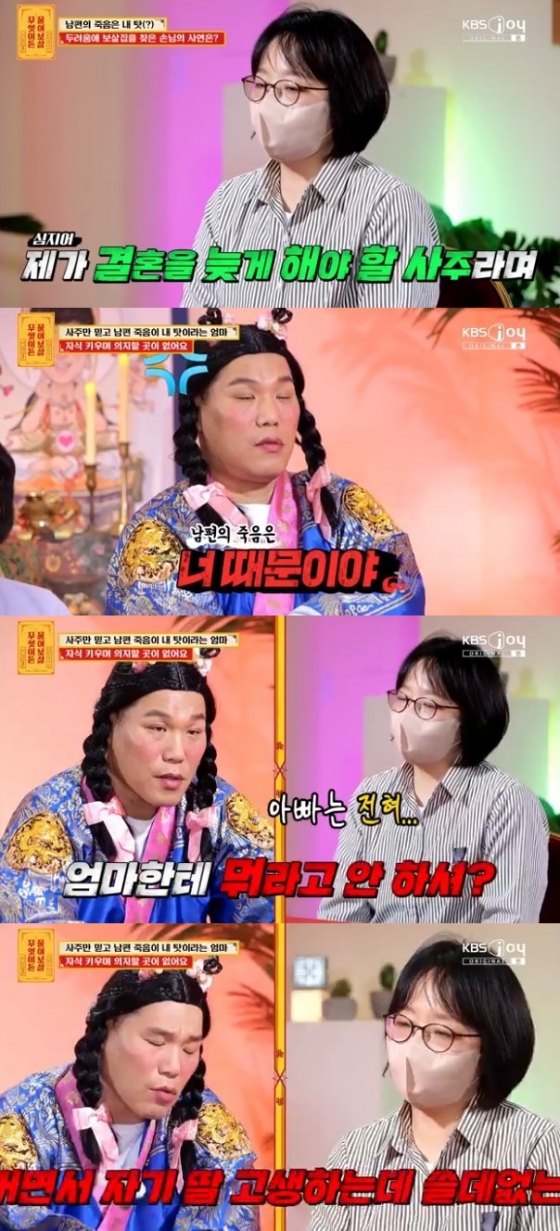사연자는 "모친하고도 갈등이 있다. 남편이 송전탑 현장 근무자였고, 나이차이도 많아서 결혼할 때 많이 반대하셨다. 또 내게 결혼을 늦게해야 하는 사주가 있다면서 그것 때문에 나와 남편 사이를 더 반대하셨다"고 설명했다. 이어 "남편과 22살에 결혼 후 9년 전 사별했을 때도 어머니께서 제 사주 탓을 하셨다"고 밝혀 '보살즈'(이수근+서장훈)를 놀라게 했다.