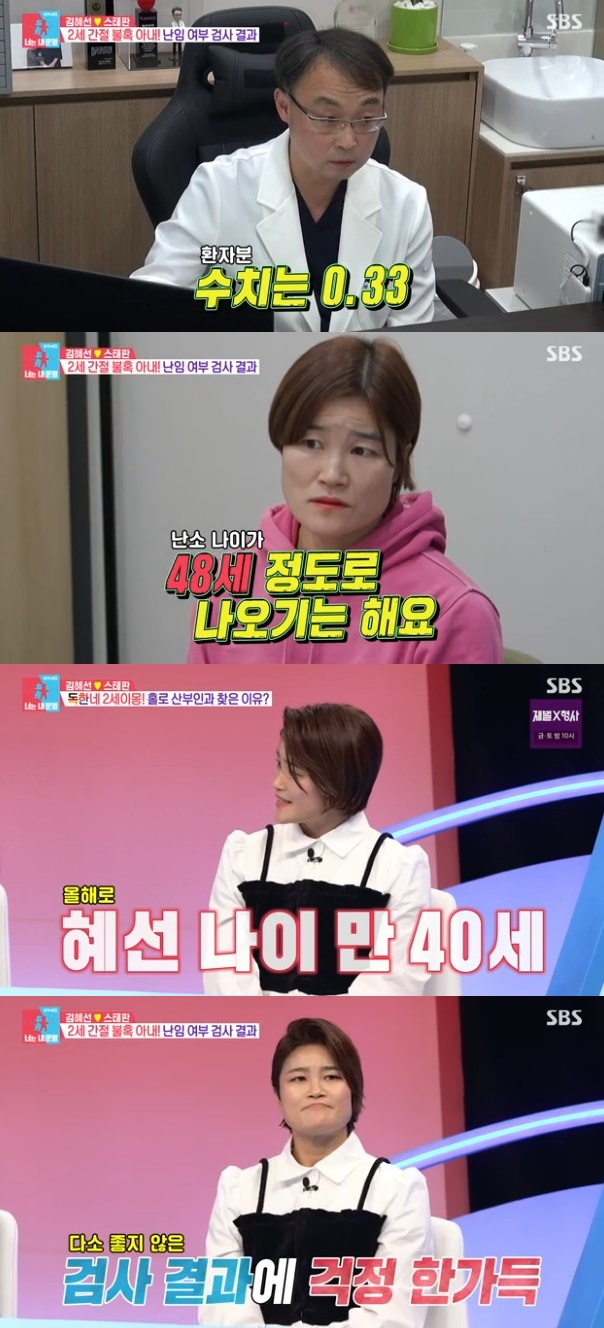 그러자 주치의는 "일시적으로 배란 기능에 문제가 올순있다. 크게 걱정하지마라"며 김혜선을 안심시켰다. 그는 "피검사는 정상 범위다. 여성호르몬도 정상 수치다. 전체적으로 괜찮은데 '항뮬러관호르몬 검사'(난소의 생식능력을 간접적으로 보는 검사) 결과가 0.33이 나왔다. 난소 나이가 48세 정도다. 환자분의 생물학적 나이인 40세 보다 높게 나왔다"라고 설명했다.