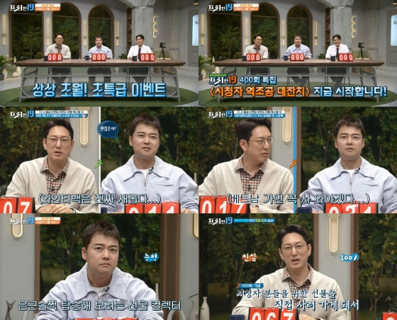 지난 29일 방송된 '프리한 19'에선 400회 기념 상상 초월 시청자 역조공 대잔치를 마련했다. '더 사 올걸 티켓팅 부르는 여행 특산품 19'주제인 만큼 특종기사 1위를 하게 된 기자가 직접 해외로 선물 공수에 나서게 된 것. 국내엔 잘 알려지지 않아 조금 사면 후회되는 필수 NEW 쇼핑 아이템들이 소개되자 전현무와 한석준은 그 어느 때보다 샘솟는 의지를 표출했다.