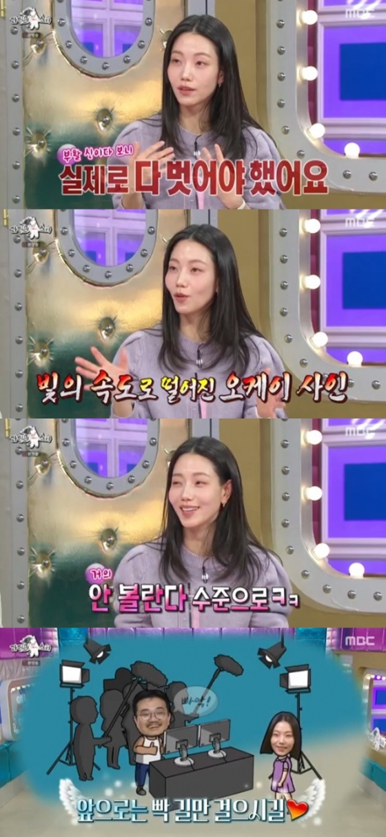 그러면서 "실제로 다 벗었어야했다. 연상호 감독님도 나체 촬영이 처음이셨다. 연기하려고 탈의하고 누웠는데 굉장히 오케이 사인이 빨리 떨어졌다"며 "감독님이 이런게 처음이고 하기 싫으시니까 거의 '안 볼란다' 수준이었다"라고 말해 모두를 폭소케 했다.