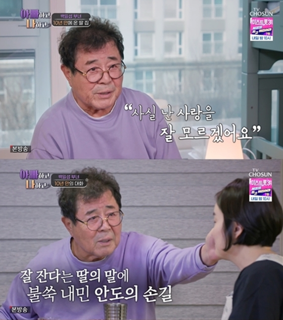 백일섭이 "요즘 '아빠하고 나하고' 하면서 잠을 못 잔다"라고 하자, 사위 또한 "프로그램 이후 아버님하고 저하고 잠을 못 자고 있다"라며 공감했다. "근데 지은이는 잘 잔다"라는 사위의 말에 백일섭은 딸의 볼을 쓰다듬었다. 이에 지은 씨는 "아빠가 많이 용기를 내고 있구나, 나도 조금 살가운 딸이 되도록 노력해 봐야겠다"라고 답했다. 어떤 마음으로 딸의 볼을 쓰다듬었냐는 질문에 백일섭은 "내 딸이니까 사랑하는 마음으로... 나한테는 전부라고도 할 수 있다"라며 애틋한 부성애를 드러내 시청자들의 눈물샘을 자극했다.