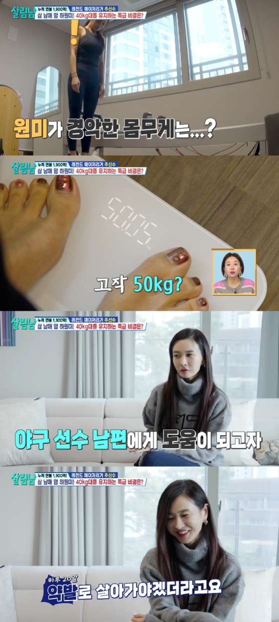 평소 49kg를 유지한다는 하원미는 아침부터 필라테스를 했다. 몸무게를 잰 하원미는 50.5kg임에 놀라며 "마이크를 빼면 49kg인데"라고 아쉬워했다.