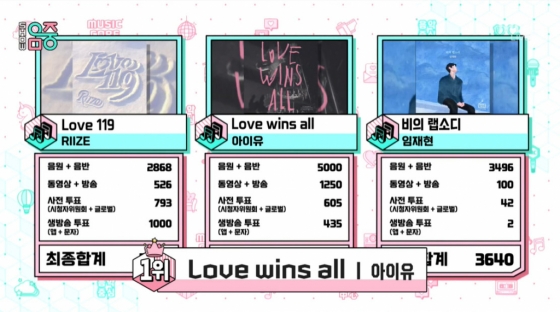 이날 1위 후보는 라이즈 '러브 원원나인'(Love 119), 아이유 '러브 윈즈 올'(Love wins all), 임재현 '비의 랩소디'가 이름을 올렸다. 치열한 접전 끝, 아이유가 1위 트로피의 주인공이 됐다. 그는 이번 방송에 출연하지 않았음에도 불구하고 1위 하며 여전한 자신의 영향력을 입증했다.