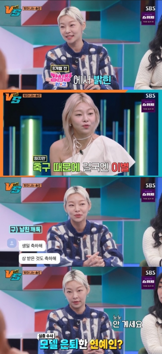 이날 방송에서 송해나는 '2023 SBS 연예대상'에서 우수상을 수상 후 지난 방송에서 언급했던 구 남친이 다시 연락이 왔다고 밝혔다. 그는 "제가 8개월 전 '강심장VS'에 처음 나왔을 때 얘기했던 그 전 남친이다"라고 알렸다.
