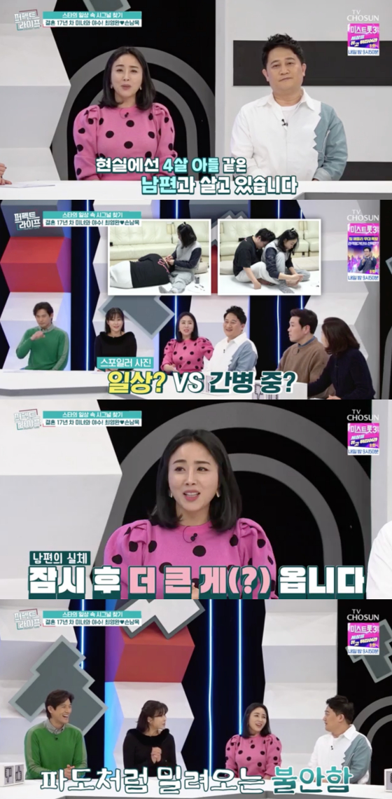 이날 스튜디오에는 최영완이 손남목의 발톱을 깎아주는 사진이 공개돼 충격을 안겼다. 이어 등장한 최영완은 "9살 연상이지만 현실에서는 4살 아들 같은 남편과 살고 있다"며 결혼 17년 차인 남편 손남목을 소개했다.