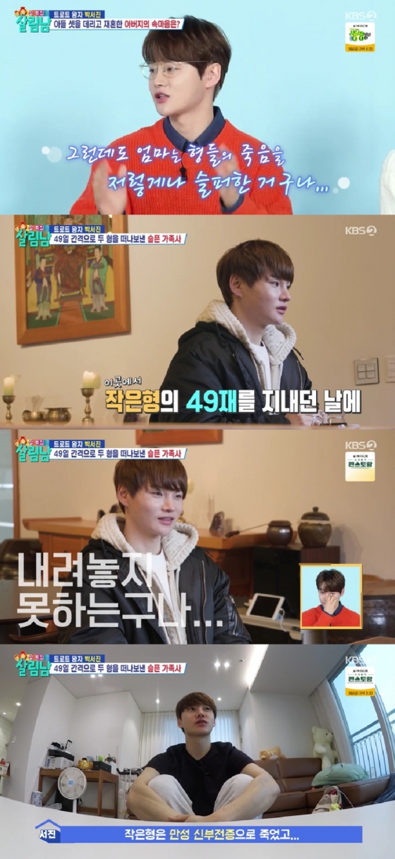 박서진은 "간암 투병 중이던 큰형이 간 이식 부작용으로, 작은형은 만성 신부전증으로 죽었다. 엄마, 아빠가 배 타고 나가면 형들이 저를 키웠다"며 "작은 형이 가수의 꿈을 이뤄주기 위해 큰 노력을 해줬다. 계속 그리울 것 같다"고 형들과 함께한 과거를 추억했다.