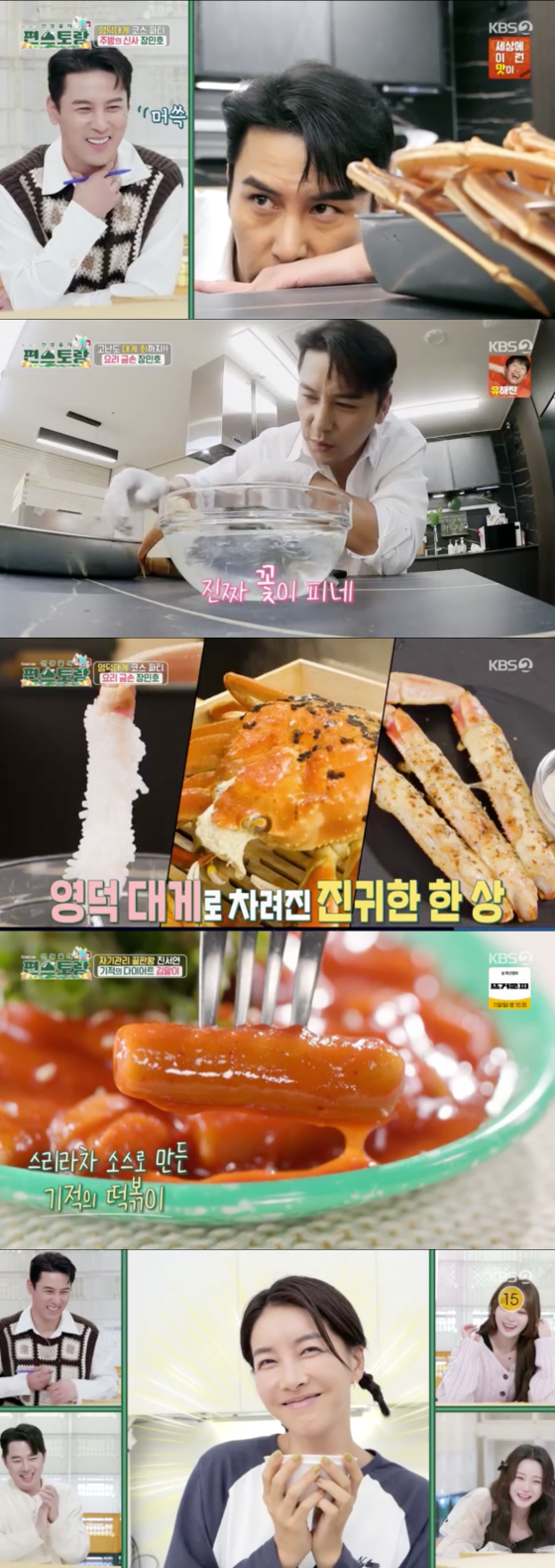 장민호의 집에는 영덕 대게가 직배송됐다. 장민호는 비린내를 잡기 위해 대게 피를 빼는 등 능숙한 손질로 놀라움을 안겼다. 이어 두 마리는 삼나무 찜기에 찌고, 한 마리는 직접 대게 회를 떴다. 이후 버터구이, 볶음밥과 콩나물 해장 라면까지 풀 코스를 선보여 군침을 자아냈다.