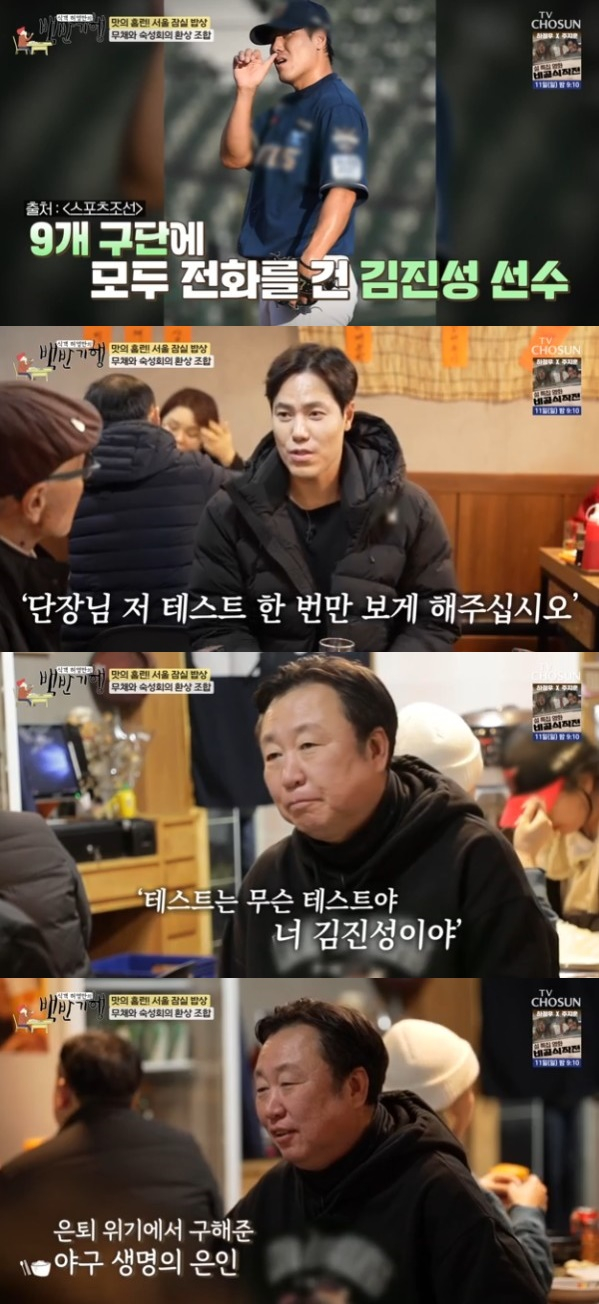 김진성은 "저는 좀 더 할 수 있다고 생각을 해서 지푸라기 잡는 심정으로 전화를 드렸다"며 "'단장님 저 테스트 한 번만 보게 해주십시오'라고 했는데 '네가 무슨 테스트냐. 김진성인데' 그 말을 해주셨다. 되게 울컥했다. 와이프도 너무 감사하신 분이라고 했다. 제 은인이시다"라고 설명했다.