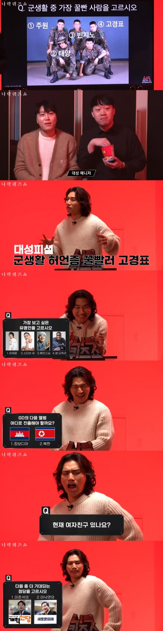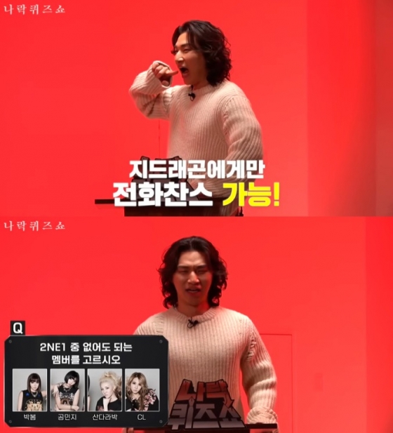 그룹 빅뱅 출신 가수 대성이 '나락퀴즈쇼'에서 지드래곤과 2NE1(투애니원)을 언급하며 괴로워했다.