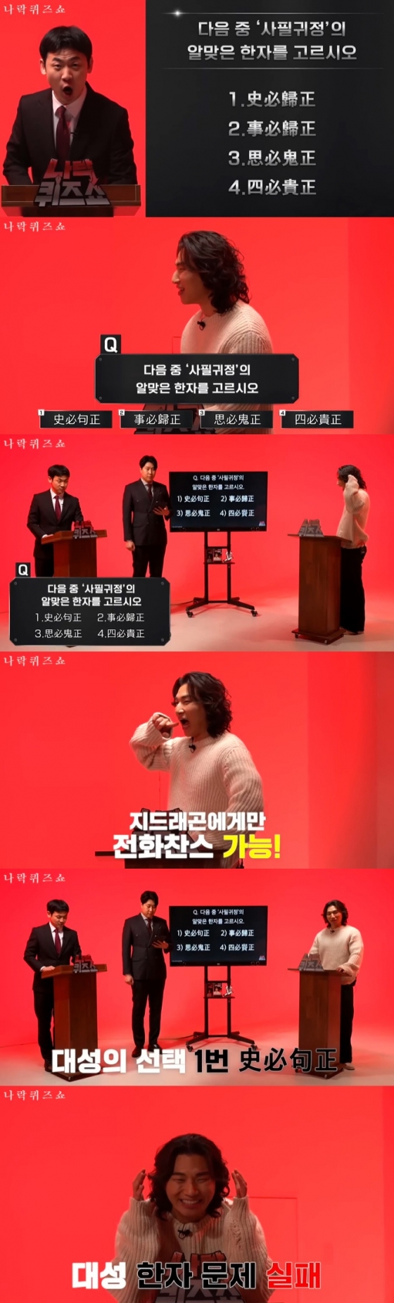 대성이 한자를 헷갈려하자 김민수는 "문제가 어렵기 때문에 전화찬스도 가능하다. 단 지드래곤에게만 가능하다"고 했고, 대성은 "앗, 안 쓰겠다"라고 했다. 대성은 사지선다에서 정답을 선택했지만 다른 한자를 선택해 오답이 됐다.