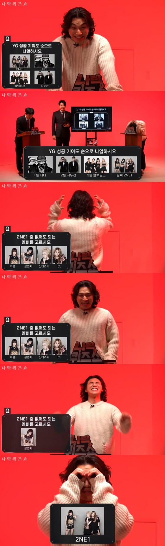 MC 이용주는 "2NE1 멤버 중 가장 기여도가 낮은 멤버를 고르시오"라고 말하며 자막엔 '없어도 되는 멤버'라고 함정 문제를 냈다. 대성은 "이런 이런!"이라고 소리치다가 "없어도 되는 멤버? 너무한다"라면서도 "산다라박? 공민지? 박봄? 공민지로 하겠다. 오빠가 이런 덴 줄 모르고 나왔어"라고 억울함을 토로하고 쇼가 끝났다.