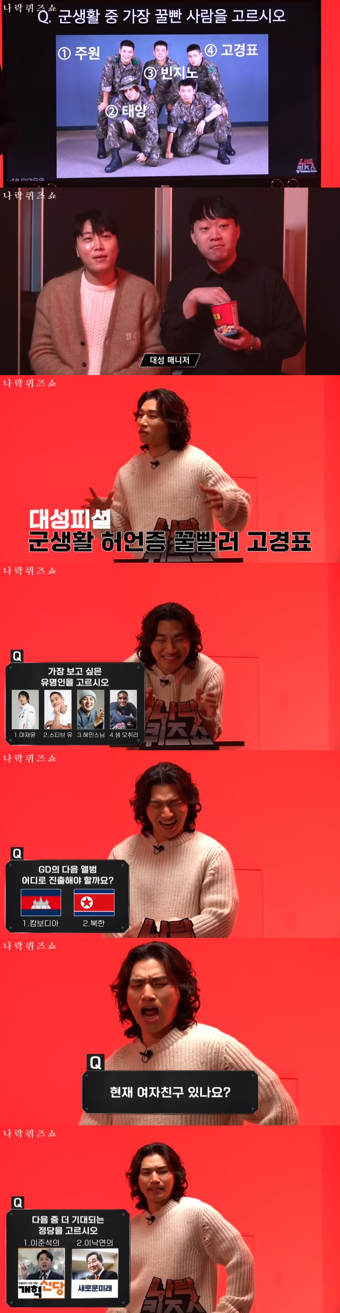대성은 YG에 얼마나 소속돼 있었냐는 질문에 "2006년에 데뷔해서 16, 17년 정도 있었다"라고 했다. 이에 김민수는 'YG 성공, 기여도 순으로 나열하시오'라고 문제를 냈고, 대성은 "테디 형님, 지누션 형님, 블랙핑크, 2NE1" 순서로 대답하며 "(보기에서) 빅뱅이 없네. 우리가 제일 낮긴 한데"라고 말했다.