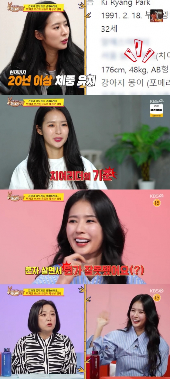 박기량은 "다들 몸무게 앞자리가 4 아니냐. 나는 몸무게 앞자리가 5를 넘어본 적이 없다. 고등학생 때 몸무게를 20년 동안 유지했다"며 "저는 키 176cm, 몸무게 48kg이 치어리더의 기준이다. 저도 계속 그렇게 유지를 했다. (후배들은) 저보다 키가 작기 때문에 저보다 가벼워야 할 것 같다"고 말했다.