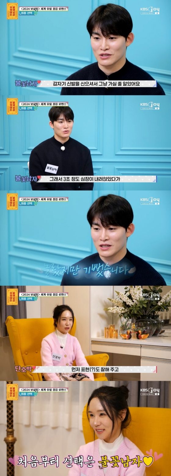 또한 불꽃남자는 "첫 짝꿍은 다른 사람이었는데 단호박과 커플이 돼서 너무 좋았다. 밥 먹으면서 얘기를 많이 했는데 나는 몰랐는데 다른 프로그램에서 되게 유명하신 분이더라. 어떻게 다가갈지 고민이다"라고 이야기했다.