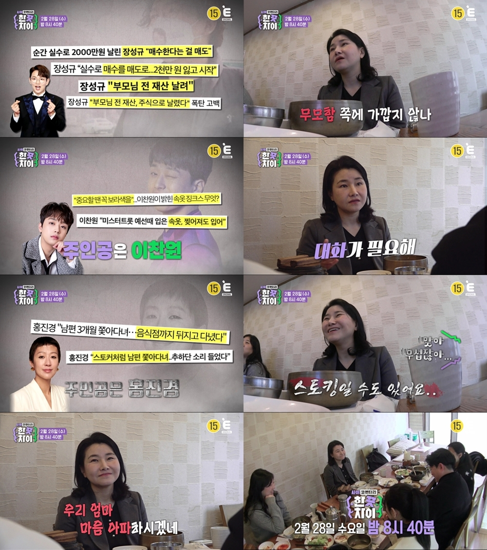 티캐스트 E채널 '한 끗 차이: 사이코멘터리'(이하 한끗차이) 제작진은 3MC 홍진경X장성규X이찬원의 실제 이야기를 마치 PD 지인의 이야기인 것처럼 속여 박지선 교수에게 상담하는 장면을 '깜짝 카메라'에 담았다.