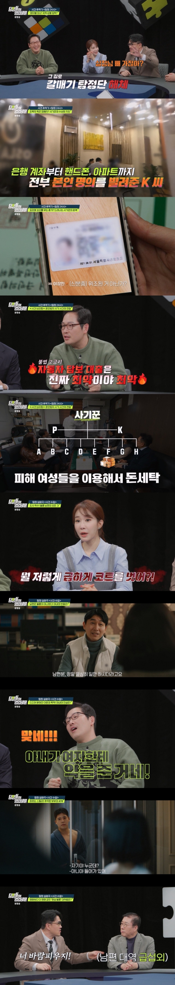 이어 3MC는 물론 시청자들의 공분을 샀던 역대급 혼인빙자 사기 사건 추적기가 본격적으로 다시 시작됐다. 계속된 추적 끝에 갈매기 탐정단은 의뢰인이 사기꾼과 함께 만났다던 지인 K 씨와 접촉했다. K씨는 자신도 사기꾼과 1년 전 우연히 알게 된 사이라며, 자신도 사기꾼에게 그저 이용당한 피해자이며 공범은 아니라고 주장했다. 하지만 K씨는 사기꾼에게 은행 계좌부터 휴대전화, 아파트에 이르기까지 다양하게 자신의 명의를 빌려준 상황이었다. 남성태 변호사는 "지금 금전 피해가 5억원에서 50억 원 사이인데, 이건 단순 형법이 아니라 특정경제범죄 가중처벌 등에 관한 법률에 의해 가담만 했더라도 징역형이 나올 수 있다"고 설명하며 "또 명의를 빌려주거나 팔거나 하는 행위가 전부 불법이다. 형사 처벌을 받을 수 있으니 절대 하시면 안 된다"고 신신당부했다.