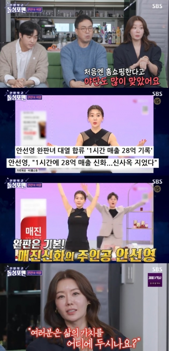 이에 안선영은 "처음엔 홈쇼핑한다고 선배들한테 야단도 많이 맞았다. '왜 배우가 TV에 나와서 물건을 파냐'고. 밖에 복도 서있고 그랬다"며 당시를 떠올렸다.