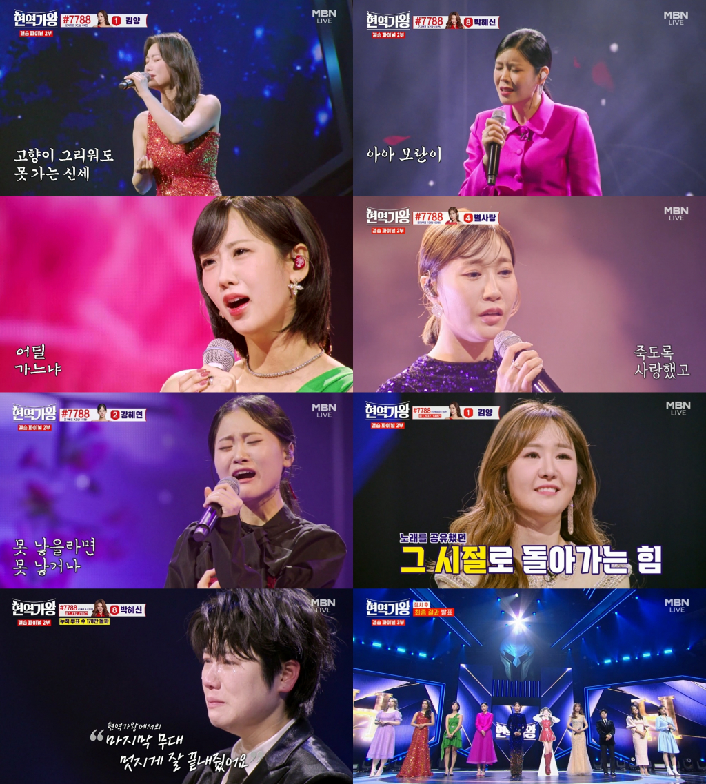 이날 최종회에서는 준결승전을 통해 선발된 '현역가왕' TOP10 강혜연-김다현-김양-린-마리아-마이진-박혜신-별사랑-윤수현-전유진이 결승 1라운드에 이어 가족들이 지켜보는 결승 2라운드 무대에서 자신의 인생사를 담은 '현역의 노래'를 열창하는 모습으로 묵직한 감동을 안겼다.