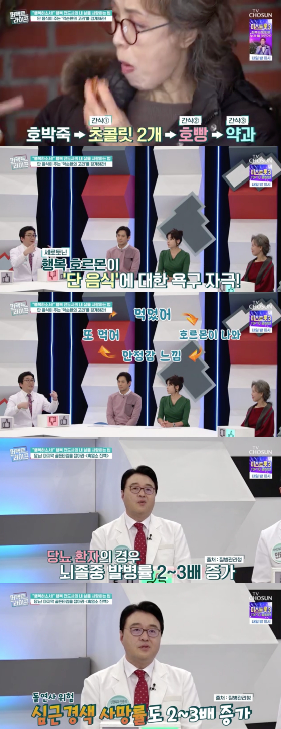 가족들과 단란한 하루를 보낸 정덕희는 호박죽을 먹고 간식으로 초콜릿, 호빵, 약과 등을 연달아 먹어 출연자들을 당황시켰다. 이에 가정의학과 전문의 유병욱은 "스트레스 받을 때 단 게 먹고 싶다면 설탕 중독을 의심해봐야 한다"고 진단했다.