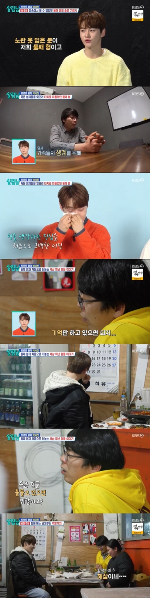박서진은 둘째 형과 먼저 세상을 떠난 첫째 형에 대한 이야기를 이어나갔다. 박서진은 세상을 떠난 형을 그리워했다. 세월이 지나면서 형들에 대해 잊혀지는 것에 대해 미안해 하는 마음을 드러내기도 했다. 이런 박서진은 둘째 형에게 "형은 형이 죽고, 동생이 죽은 거잖아"라면서 "나는 셋째 형이 더 생각나거든"이라고 말했다. 이에 둘째 형은 "둘째 나는 둘다. 셋째 죽을 때 내가 남해에서 일용직 다닐 때 못 봤단 말이야"라면서 "형은 내가 병원에 며칠 같이 있었다. (형이) 나중에 소변도 가리지 못했던 상황이었다. 형님한테 그 말했다. '이럴거면 차라리 죽으라'고. 그게 나중에 계속 지금까지 (걸린다). 내가 왜 그런 소리를 했을까. 여러 가지가 많이 스쳐지나 간다"라고 털어놓았다.